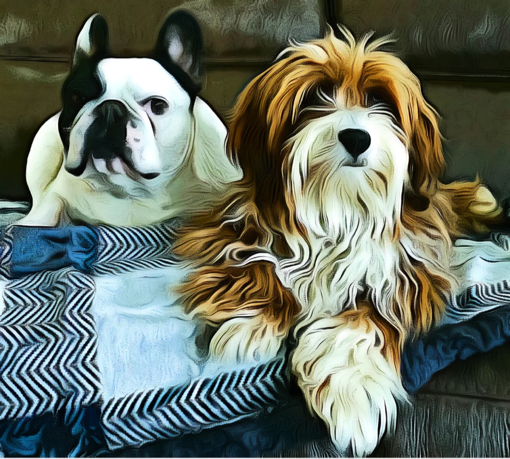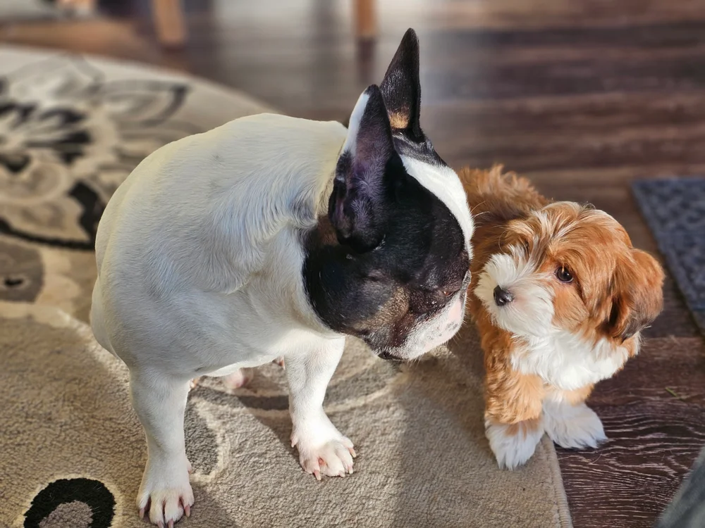 Let me tell you… this girl has my heart!!! She is absolutely stunning and has a beautiful structure and movement too. She has the most beautiful red and white Irish Pied coat of easy to maintain hair! She loves all other dogs and loves a good game of chase. She even loves to throw a toy into the air to catch it! In fact… she really is a toy hoarder! Lol… she will pile her toys all up around her as she chooses her favorite to chew on! Aubrey has been extensively obedience trained with our favorite trainer and knows so many different tricks and commands. She loves to sit at my feet and feels most comfortable there. Her best friends are our Heavenly Trix and our Frenchie Willis! She is still young, only 1.5 years old. We do plan to breed her for the first time when she is 2 years old. Stay tuned for the highly sought after ‘Reds’ from our planned Aubrey and Oscar litter for 2025!