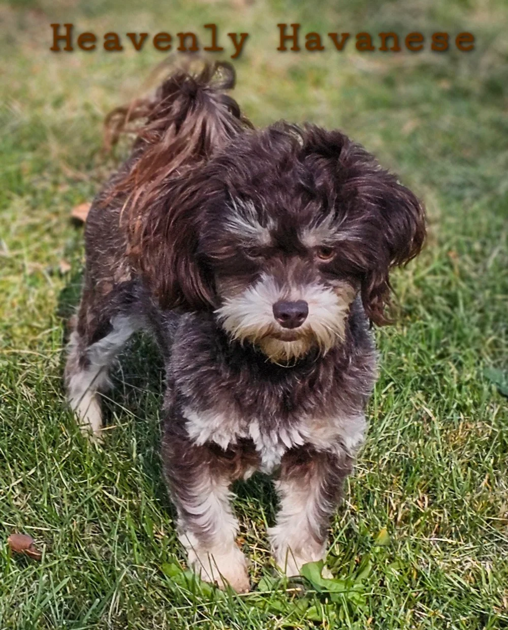 Well… to say the least, we are very grateful for Sloan! She is the sweetest girl! My sister Meg and I produced Sloan from Winnie and Kip! Winnie and Kip go back to our first generation of Heavenly Havanese Lucy and Eddy, Molly and Michael. Sloan is about 6 generations in the making for Heavenly Havanese and we have also kept her son Rigatoni as well! We are very excited about Rigatoni! Sloan is a compact, small 8 lb, chocolate, tricolored Havanese with the most beautiful personality, temperament, structure and coat! She is highly intelligent and LOVES being a mom! Sloan is confident and loves teaching her puppies all about the world!!! Stay tuned for more to come from Sloan and Oscar!