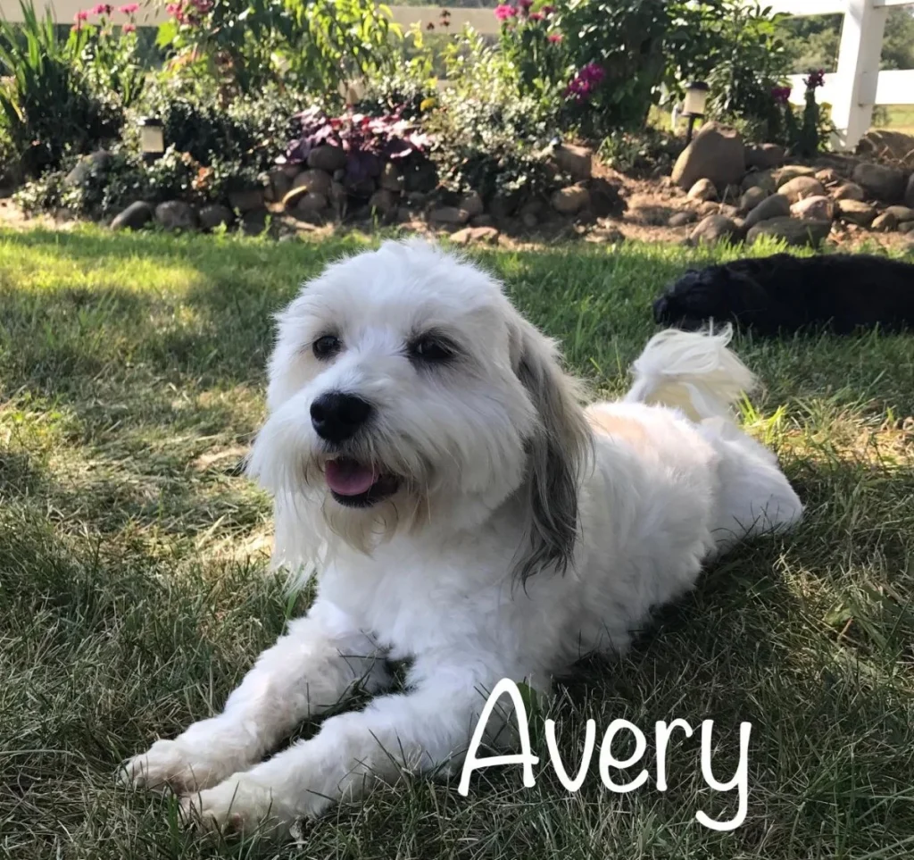 Avery has a beautiful white coat with caramel spots. She has hair that will grow very long. She has a stunning conformation and appearance. She weighs about 14 lbs which is at the top of the recommended breed standard. When Avery walks she prances.