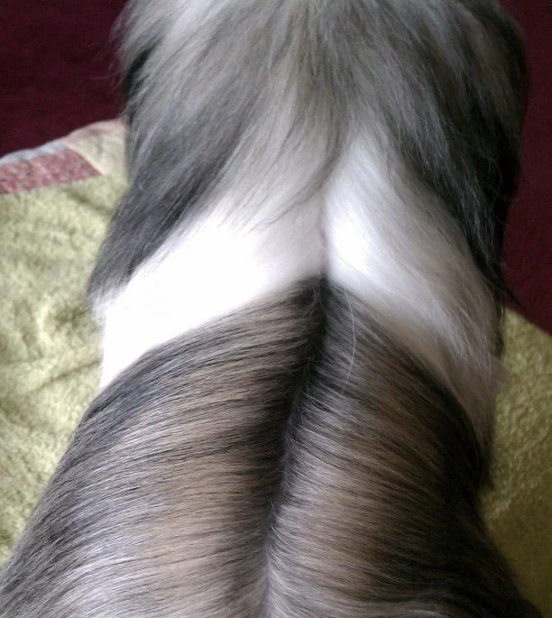 Molly has a wonderful coat of hair and she reminds me of a teddy bear. She is very fluffy and her hair is very soft. She is black and white Irish pied with a black head and eyes and white around her muzzle.